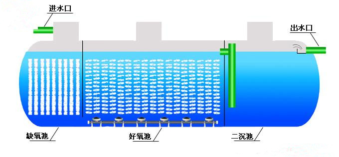 一體化污水處理設備是將一沉池、I、II級接觸氧化池、二沉池、污泥池集中一體的設備,并在I、II級接觸氧化池中進行鼓風曝氣,使接觸氧化法和活性污泥法有效的結合起來,節(jié)省了找人設計污水處理工藝和做基礎建設的繁瑣。